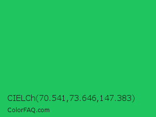 CIELCh 70.541,73.646,147.383 Color is a normal green color and the nearest color is Malachite #0bda51. Hex code #1fc660 and RGB value is rgb(31,198,96). In RGB color space, this color is composed of 12% red, 78% green, 38% blue, In CMYK color space, this color is composed of 84% cyan, 0% magenta, 52% yellow , 22% black , In HSL color space, this color has a hue angle of 143° , 73% saturation and 45% lightness.