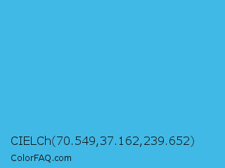 CIELCh 70.549,37.162,239.652 Color is a normal blue color and the nearest color is Picton Blue #45b1e8. Hex code #41b9e6 and RGB value is rgb(65,185,230). In RGB color space, this color is composed of 25% red, 73% green, 90% blue, In CMYK color space, this color is composed of 72% cyan, 20% magenta, 0% yellow , 10% black , In HSL color space, this color has a hue angle of 196° , 77% saturation and 58% lightness.