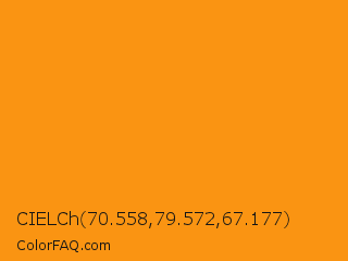 CIELCh 70.558,79.572,67.177 Color is a normal orange color and the nearest color is West Side #ff910f. Hex code #fa9412 and RGB value is rgb(250,148,18). In RGB color space, this color is composed of 98% red, 58% green, 7% blue, In CMYK color space, this color is composed of 0% cyan, 41% magenta, 93% yellow , 2% black , In HSL color space, this color has a hue angle of 34° , 96% saturation and 53% lightness.