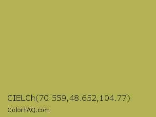 CIELCh 70.559,48.652,104.77 Color is a normal yellow color and the nearest color is Olive Green #b5b35c. Hex code #b2b154 and RGB value is rgb(178,177,84). In RGB color space, this color is composed of 70% red, 69% green, 33% blue, In CMYK color space, this color is composed of 0% cyan, 1% magenta, 53% yellow , 30% black , In HSL color space, this color has a hue angle of 59° , 38% saturation and 51% lightness.