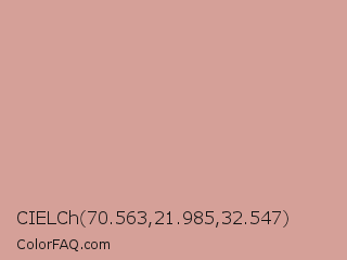 CIELCh 70.563,21.985,32.547 Color is a light red color and the nearest color is Eunry #cfa39d. Hex code #d5a098 and RGB value is rgb(213,160,152). In RGB color space, this color is composed of 84% red, 63% green, 60% blue, In CMYK color space, this color is composed of 0% cyan, 25% magenta, 29% yellow , 16% black , In HSL color space, this color has a hue angle of 8° , 42% saturation and 72% lightness.