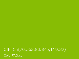 CIELCh 70.563,80.845,119.32 Color is a normal lime color and the nearest color is Apple Green #8db600. Hex code #87bd04 and RGB value is rgb(135,189,4). In RGB color space, this color is composed of 53% red, 74% green, 2% blue, In CMYK color space, this color is composed of 29% cyan, 0% magenta, 98% yellow , 26% black , In HSL color space, this color has a hue angle of 78° , 96% saturation and 38% lightness.