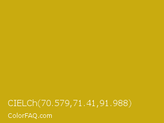 CIELCh 70.579,71.41,91.988 Color is a normal yellow color and the nearest color is Buddha Gold #c1a004. Hex code #c9ab0f and RGB value is rgb(201,171,15). In RGB color space, this color is composed of 79% red, 67% green, 6% blue, In CMYK color space, this color is composed of 0% cyan, 15% magenta, 93% yellow , 21% black , In HSL color space, this color has a hue angle of 50° , 86% saturation and 42% lightness.