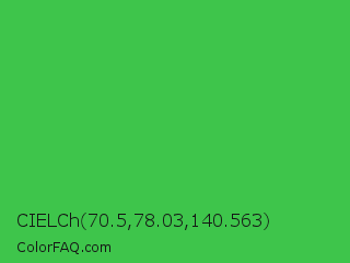 CIELCh 70.5,78.03,140.563 Color is a normal green color and the nearest color is Lime Green #32cd32. Hex code #3ec54b and RGB value is rgb(62,197,75). In RGB color space, this color is composed of 24% red, 77% green, 29% blue, In CMYK color space, this color is composed of 69% cyan, 0% magenta, 62% yellow , 23% black , In HSL color space, this color has a hue angle of 126° , 54% saturation and 51% lightness.