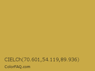 CIELCh 70.601,54.119,89.936 Color is a normal yellow color and the nearest color is Roti #c6a84b. Hex code #c9aa46 and RGB value is rgb(201,170,70). In RGB color space, this color is composed of 79% red, 67% green, 27% blue, In CMYK color space, this color is composed of 0% cyan, 15% magenta, 65% yellow , 21% black , In HSL color space, this color has a hue angle of 46° , 55% saturation and 53% lightness.