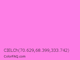 CIELCh 70.629,68.399,333.742 Color is a light magenta color and the nearest color is Pale Magenta #f984e5. Hex code #fe7ee5 and RGB value is rgb(254,126,229). In RGB color space, this color is composed of 100% red, 49% green, 90% blue, In CMYK color space, this color is composed of 0% cyan, 50% magenta, 10% yellow , 0% black , In HSL color space, this color has a hue angle of 312° , 98% saturation and 75% lightness.