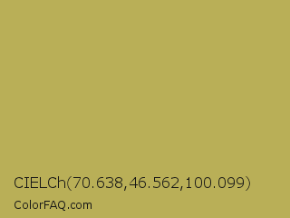 CIELCh 70.638,46.562,100.099 Color is a normal yellow color and the nearest color is Olive Green #b5b35c. Hex code #b9af57 and RGB value is rgb(185,175,87). In RGB color space, this color is composed of 73% red, 69% green, 34% blue, In CMYK color space, this color is composed of 0% cyan, 5% magenta, 53% yellow , 27% black , In HSL color space, this color has a hue angle of 54° , 41% saturation and 53% lightness.