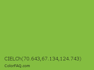 CIELCh 70.643,67.134,124.743 Color is a normal green color and the nearest color is Sushi #87ab39. Hex code #84bd40 and RGB value is rgb(132,189,64). In RGB color space, this color is composed of 52% red, 74% green, 25% blue, In CMYK color space, this color is composed of 30% cyan, 0% magenta, 66% yellow , 26% black , In HSL color space, this color has a hue angle of 87° , 49% saturation and 50% lightness.