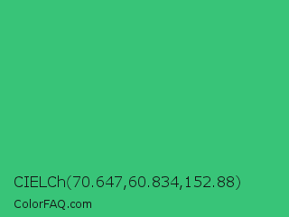 CIELCh 70.647,60.834,152.88 Color is a normal green color and the nearest color is UFO Green #3cd070. Hex code #38c478 and RGB value is rgb(56,196,120). In RGB color space, this color is composed of 22% red, 77% green, 47% blue, In CMYK color space, this color is composed of 71% cyan, 0% magenta, 39% yellow , 23% black , In HSL color space, this color has a hue angle of 147° , 56% saturation and 49% lightness.