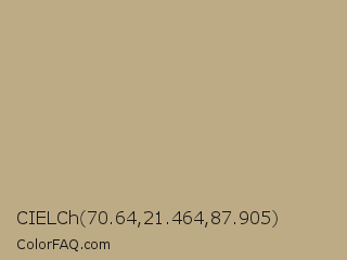 CIELCh 70.64,21.464,87.905 Color is a light orange color and the nearest color is Sand Ecru #c2b280. Hex code #bdab86 and RGB value is rgb(189,171,134). In RGB color space, this color is composed of 74% red, 67% green, 53% blue, In CMYK color space, this color is composed of 0% cyan, 10% magenta, 29% yellow , 26% black , In HSL color space, this color has a hue angle of 40° , 29% saturation and 63% lightness.