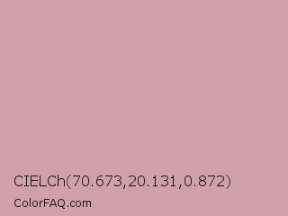 CIELCh 70.673,20.131,0.872 Color is a light rose color and the nearest color is Careys Pink #d29eaa. Hex code #d1a0ad and RGB value is rgb(209,160,173). In RGB color space, this color is composed of 82% red, 63% green, 68% blue, In CMYK color space, this color is composed of 0% cyan, 23% magenta, 17% yellow , 18% black , In HSL color space, this color has a hue angle of 344° , 35% saturation and 72% lightness.