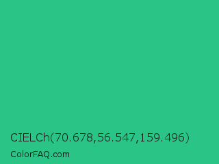 CIELCh 70.678,56.547,159.496 Color is a normal green color and the nearest color is Mountain Meadow #30ba8f. Hex code #2ac487 and RGB value is rgb(42,196,135). In RGB color space, this color is composed of 16% red, 77% green, 53% blue, In CMYK color space, this color is composed of 79% cyan, 0% magenta, 31% yellow , 23% black , In HSL color space, this color has a hue angle of 156° , 65% saturation and 47% lightness.