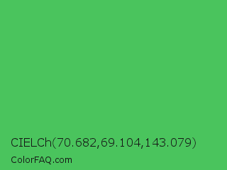 CIELCh 70.682,69.104,143.079 Color is a normal green color and the nearest color is UFO Green #3cd070. Hex code #4ac45d and RGB value is rgb(74,196,93). In RGB color space, this color is composed of 29% red, 77% green, 36% blue, In CMYK color space, this color is composed of 62% cyan, 0% magenta, 53% yellow , 23% black , In HSL color space, this color has a hue angle of 129° , 51% saturation and 53% lightness.