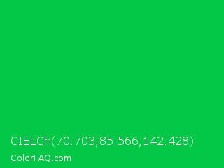CIELCh 70.703,85.566,142.428 Color is a normal green color and the nearest color is Dark Pastel Green #03c03c. Hex code #03c845 and RGB value is rgb(3,200,69). In RGB color space, this color is composed of 1% red, 78% green, 27% blue, In CMYK color space, this color is composed of 99% cyan, 0% magenta, 66% yellow , 22% black , In HSL color space, this color has a hue angle of 140° , 97% saturation and 40% lightness.