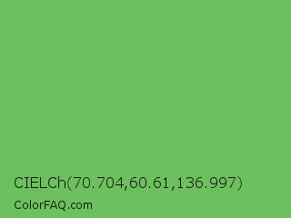 CIELCh 70.704,60.61,136.997 Color is a normal green color and the nearest color is Mantis #74c365. Hex code #6dc05e and RGB value is rgb(109,192,94). In RGB color space, this color is composed of 43% red, 75% green, 37% blue, In CMYK color space, this color is composed of 43% cyan, 0% magenta, 51% yellow , 25% black , In HSL color space, this color has a hue angle of 111° , 44% saturation and 56% lightness.