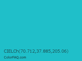 CIELCh 70.712,37.885,205.06 Color is a normal cyan color and the nearest color is Java #1fc2c2. Hex code #1fbfc9 and RGB value is rgb(31,191,201). In RGB color space, this color is composed of 12% red, 75% green, 79% blue, In CMYK color space, this color is composed of 85% cyan, 5% magenta, 0% yellow , 21% black , In HSL color space, this color has a hue angle of 184° , 73% saturation and 45% lightness.