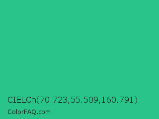 CIELCh 70.723,55.509,160.791 Color is a normal green color and the nearest color is Mountain Meadow #30ba8f. Hex code #29c48a and RGB value is rgb(41,196,138). In RGB color space, this color is composed of 16% red, 77% green, 54% blue, In CMYK color space, this color is composed of 79% cyan, 0% magenta, 30% yellow , 23% black , In HSL color space, this color has a hue angle of 158° , 65% saturation and 46% lightness.