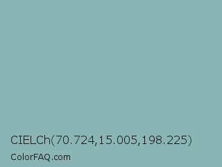 CIELCh 70.724,15.005,198.225 Color is a light cyan color and the nearest color is Gulf Stream #80b3ae. Hex code #8ab5b5 and RGB value is rgb(138,181,181). In RGB color space, this color is composed of 54% red, 71% green, 71% blue, In CMYK color space, this color is composed of 24% cyan, 0% magenta, 0% yellow , 29% black , In HSL color space, this color has a hue angle of 180° , 23% saturation and 63% lightness.
