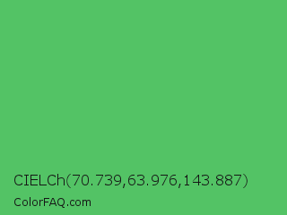 CIELCh 70.739,63.976,143.887 Color is a normal green color and the nearest color is Emerald #50c878. Hex code #53c365 and RGB value is rgb(83,195,101). In RGB color space, this color is composed of 33% red, 76% green, 40% blue, In CMYK color space, this color is composed of 57% cyan, 0% magenta, 48% yellow , 24% black , In HSL color space, this color has a hue angle of 130° , 48% saturation and 55% lightness.