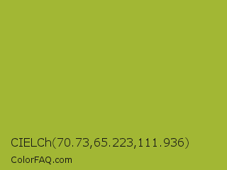 CIELCh 70.73,65.223,111.936 Color is a normal yellow color and the nearest color is Android Green #a4c639. Hex code #a2b734 and RGB value is rgb(162,183,52). In RGB color space, this color is composed of 64% red, 72% green, 20% blue, In CMYK color space, this color is composed of 11% cyan, 0% magenta, 72% yellow , 28% black , In HSL color space, this color has a hue angle of 70° , 56% saturation and 46% lightness.