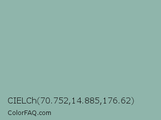 CIELCh 70.752,14.885,176.62 Color is a light cyan color and the nearest color is Summer Green #96bbab. Hex code #8fb5ab and RGB value is rgb(143,181,171). In RGB color space, this color is composed of 56% red, 71% green, 67% blue, In CMYK color space, this color is composed of 21% cyan, 0% magenta, 6% yellow , 29% black , In HSL color space, this color has a hue angle of 164° , 20% saturation and 64% lightness.