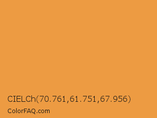CIELCh 70.761,61.751,67.956 Color is a normal orange color and the nearest color is Neon Carrot #ffa343. Hex code #ed9b42 and RGB value is rgb(237,155,66). In RGB color space, this color is composed of 93% red, 61% green, 26% blue, In CMYK color space, this color is composed of 0% cyan, 35% magenta, 72% yellow , 7% black , In HSL color space, this color has a hue angle of 31° , 83% saturation and 59% lightness.