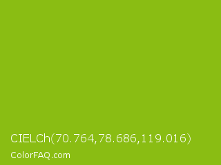 CIELCh 70.764,78.686,119.016 Color is a normal lime color and the nearest color is Lima #76bd17. Hex code #8abd13 and RGB value is rgb(138,189,19). In RGB color space, this color is composed of 54% red, 74% green, 7% blue, In CMYK color space, this color is composed of 27% cyan, 0% magenta, 90% yellow , 26% black , In HSL color space, this color has a hue angle of 78° , 82% saturation and 41% lightness.