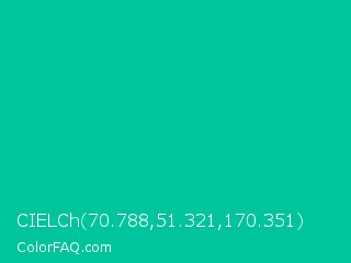 CIELCh 70.788,51.321,170.351 Color is a normal cyan color and the nearest color is Caribbean Green #00cc99. Hex code #00c49c and RGB value is rgb(0,196,156). In RGB color space, this color is composed of 0% red, 77% green, 61% blue, In CMYK color space, this color is composed of 100% cyan, 0% magenta, 20% yellow , 23% black , In HSL color space, this color has a hue angle of 168° , 100% saturation and 38% lightness.