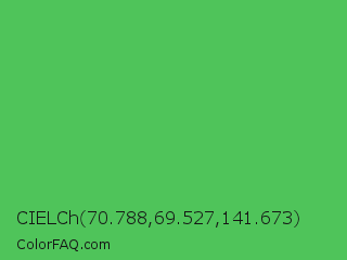 CIELCh 70.788,69.527,141.673 Color is a normal green color and the nearest color is Fern #63b76c. Hex code #4fc45a and RGB value is rgb(79,196,90). In RGB color space, this color is composed of 31% red, 77% green, 35% blue, In CMYK color space, this color is composed of 60% cyan, 0% magenta, 54% yellow , 23% black , In HSL color space, this color has a hue angle of 126° , 50% saturation and 54% lightness.