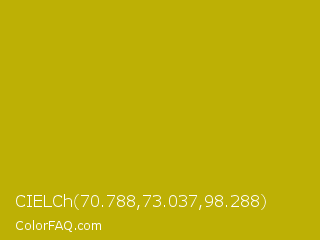 CIELCh 70.788,73.037,98.288 Color is a normal yellow color and the nearest color is Buddha Gold #c1a004. Hex code #bdb005 and RGB value is rgb(189,176,5). In RGB color space, this color is composed of 74% red, 69% green, 2% blue, In CMYK color space, this color is composed of 0% cyan, 7% magenta, 97% yellow , 26% black , In HSL color space, this color has a hue angle of 56° , 95% saturation and 38% lightness.