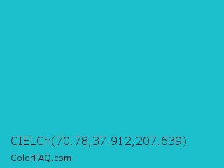 CIELCh 70.78,37.912,207.639 Color is a normal cyan color and the nearest color is Java #1fc2c2. Hex code #1cbfcc and RGB value is rgb(28,191,204). In RGB color space, this color is composed of 11% red, 75% green, 80% blue, In CMYK color space, this color is composed of 86% cyan, 6% magenta, 0% yellow , 20% black , In HSL color space, this color has a hue angle of 184° , 76% saturation and 45% lightness.