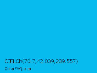CIELCh 70.7,42.039,239.557 Color is a normal cyan color and the nearest color is Cyan Process #00b7eb. Hex code #06bbee and RGB value is rgb(6,187,238). In RGB color space, this color is composed of 2% red, 73% green, 93% blue, In CMYK color space, this color is composed of 97% cyan, 21% magenta, 0% yellow , 7% black , In HSL color space, this color has a hue angle of 193° , 95% saturation and 48% lightness.