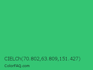 CIELCh 70.802,63.809,151.427 Color is a normal green color and the nearest color is UFO Green #3cd070. Hex code #34c573 and RGB value is rgb(52,197,115). In RGB color space, this color is composed of 20% red, 77% green, 45% blue, In CMYK color space, this color is composed of 74% cyan, 0% magenta, 42% yellow , 23% black , In HSL color space, this color has a hue angle of 146° , 58% saturation and 49% lightness.