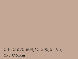 CIELCh 70.809,15.396,61.95 Color is a light orange color and the nearest color is Indian Khaki #c3b091. Hex code #c4a895 and RGB value is rgb(196,168,149). In RGB color space, this color is composed of 77% red, 66% green, 58% blue, In CMYK color space, this color is composed of 0% cyan, 14% magenta, 24% yellow , 23% black , In HSL color space, this color has a hue angle of 24° , 28% saturation and 68% lightness.