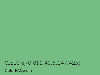 CIELCh 70.811,40.8,147.425 Color is a normal green color and the nearest color is De York #7ac488. Hex code #76bd84 and RGB value is rgb(118,189,132). In RGB color space, this color is composed of 46% red, 74% green, 52% blue, In CMYK color space, this color is composed of 38% cyan, 0% magenta, 30% yellow , 26% black , In HSL color space, this color has a hue angle of 132° , 35% saturation and 60% lightness.