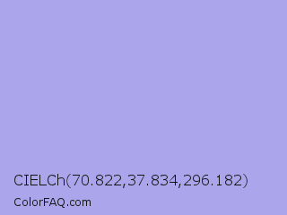CIELCh 70.822,37.834,296.182 Color is a light indigo color and the nearest color is Maximum Blue Purple #acace6. Hex code #aba6eb and RGB value is rgb(171,166,235). In RGB color space, this color is composed of 67% red, 65% green, 92% blue, In CMYK color space, this color is composed of 27% cyan, 29% magenta, 0% yellow , 8% black , In HSL color space, this color has a hue angle of 244° , 63% saturation and 79% lightness.