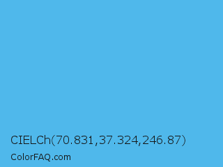 CIELCh 70.831,37.324,246.87 Color is a light blue color and the nearest color is Picton Blue #45b1e8. Hex code #4fb8eb and RGB value is rgb(79,184,235). In RGB color space, this color is composed of 31% red, 72% green, 92% blue, In CMYK color space, this color is composed of 66% cyan, 22% magenta, 0% yellow , 8% black , In HSL color space, this color has a hue angle of 200° , 80% saturation and 62% lightness.