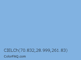 CIELCh 70.832,28.999,261.83 Color is a light blue color and the nearest color is Light Cobalt Blue #88ace0. Hex code #81b2e1 and RGB value is rgb(129,178,225). In RGB color space, this color is composed of 51% red, 70% green, 88% blue, In CMYK color space, this color is composed of 43% cyan, 21% magenta, 0% yellow , 12% black , In HSL color space, this color has a hue angle of 209° , 62% saturation and 69% lightness.