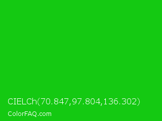 CIELCh 70.847,97.804,136.302 Color is a normal green color and the nearest color is Vivid Malachite #00cc33. Hex code #14c912 and RGB value is rgb(20,201,18). In RGB color space, this color is composed of 8% red, 79% green, 7% blue, In CMYK color space, this color is composed of 90% cyan, 0% magenta, 91% yellow , 21% black , In HSL color space, this color has a hue angle of 119° , 84% saturation and 43% lightness.