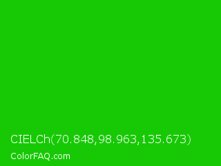 CIELCh 70.848,98.963,135.673 Color is a normal green color and the nearest color is Harlequin Green #46cb18. Hex code #17c905 and RGB value is rgb(23,201,5). In RGB color space, this color is composed of 9% red, 79% green, 2% blue, In CMYK color space, this color is composed of 89% cyan, 0% magenta, 98% yellow , 21% black , In HSL color space, this color has a hue angle of 114° , 95% saturation and 40% lightness.
