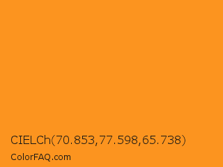 CIELCh 70.853,77.598,65.738 Color is a normal orange color and the nearest color is Tree Poppy #fc9c1d. Hex code #fc941f and RGB value is rgb(252,148,31). In RGB color space, this color is composed of 99% red, 58% green, 12% blue, In CMYK color space, this color is composed of 0% cyan, 41% magenta, 88% yellow , 1% black , In HSL color space, this color has a hue angle of 32° , 97% saturation and 55% lightness.