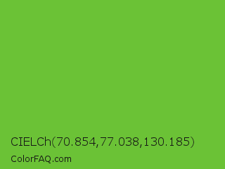 CIELCh 70.854,77.038,130.185 Color is a normal green color and the nearest color is Green RYB #66b032. Hex code #6bc236 and RGB value is rgb(107,194,54). In RGB color space, this color is composed of 42% red, 76% green, 21% blue, In CMYK color space, this color is composed of 45% cyan, 0% magenta, 72% yellow , 24% black , In HSL color space, this color has a hue angle of 97° , 56% saturation and 49% lightness.