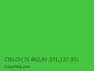 CIELCh 70.862,81.571,137.95 Color is a normal green color and the nearest color is Lime Green #32cd32. Hex code #44c640 and RGB value is rgb(68,198,64). In RGB color space, this color is composed of 27% red, 78% green, 25% blue, In CMYK color space, this color is composed of 66% cyan, 0% magenta, 68% yellow , 22% black , In HSL color space, this color has a hue angle of 118° , 54% saturation and 51% lightness.