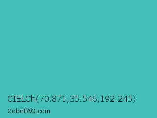 CIELCh 70.871,35.546,192.245 Color is a normal cyan color and the nearest color is Puerto Rico #3fc1aa. Hex code #43bfba and RGB value is rgb(67,191,186). In RGB color space, this color is composed of 26% red, 75% green, 73% blue, In CMYK color space, this color is composed of 65% cyan, 0% magenta, 3% yellow , 25% black , In HSL color space, this color has a hue angle of 178° , 49% saturation and 51% lightness.