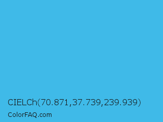 CIELCh 70.871,37.739,239.939 Color is a normal blue color and the nearest color is Picton Blue #45b1e8. Hex code #3fbae8 and RGB value is rgb(63,186,232). In RGB color space, this color is composed of 25% red, 73% green, 91% blue, In CMYK color space, this color is composed of 73% cyan, 20% magenta, 0% yellow , 9% black , In HSL color space, this color has a hue angle of 196° , 79% saturation and 58% lightness.