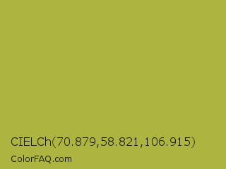 CIELCh 70.879,58.821,106.915 Color is a normal yellow color and the nearest color is Brass #b5a642. Hex code #aeb440 and RGB value is rgb(174,180,64). In RGB color space, this color is composed of 68% red, 71% green, 25% blue, In CMYK color space, this color is composed of 3% cyan, 0% magenta, 64% yellow , 29% black , In HSL color space, this color has a hue angle of 63° , 48% saturation and 48% lightness.