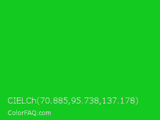 CIELCh 70.885,95.738,137.178 Color is a normal green color and the nearest color is Vivid Malachite #00cc33. Hex code #14c91f and RGB value is rgb(20,201,31). In RGB color space, this color is composed of 8% red, 79% green, 12% blue, In CMYK color space, this color is composed of 90% cyan, 0% magenta, 85% yellow , 21% black , In HSL color space, this color has a hue angle of 124° , 82% saturation and 43% lightness.