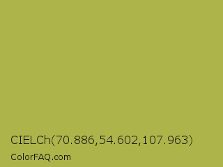 CIELCh 70.886,54.602,107.963 Color is a normal yellow color and the nearest color is Brass #b5a642. Hex code #adb44a and RGB value is rgb(173,180,74). In RGB color space, this color is composed of 68% red, 71% green, 29% blue, In CMYK color space, this color is composed of 4% cyan, 0% magenta, 59% yellow , 29% black , In HSL color space, this color has a hue angle of 64° , 42% saturation and 50% lightness.
