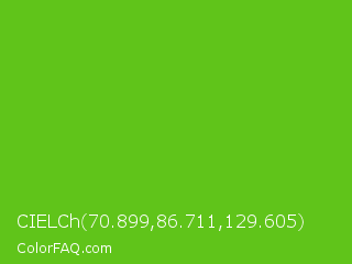 CIELCh 70.899,86.711,129.605 Color is a normal green color and the nearest color is Kelly Green #4cbb17. Hex code #60c41a and RGB value is rgb(96,196,26). In RGB color space, this color is composed of 38% red, 77% green, 10% blue, In CMYK color space, this color is composed of 51% cyan, 0% magenta, 87% yellow , 23% black , In HSL color space, this color has a hue angle of 95° , 77% saturation and 44% lightness.