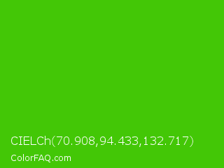 CIELCh 70.908,94.433,132.717 Color is a normal green color and the nearest color is Harlequin Green #46cb18. Hex code #43c706 and RGB value is rgb(67,199,6). In RGB color space, this color is composed of 26% red, 78% green, 2% blue, In CMYK color space, this color is composed of 66% cyan, 0% magenta, 97% yellow , 22% black , In HSL color space, this color has a hue angle of 101° , 94% saturation and 40% lightness.